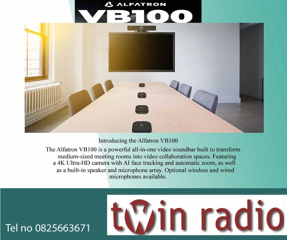 The Alfatron VB100 is a powerful all-in-one video soundbar built to transform medium-sized meeting rooms into video collaboration spaces. Featuring a 4K Ultra-HD camera with AI face tracking and automatic zoom, as well as a built-in speaker and microphone array. Optional wireless and wired microphones available.